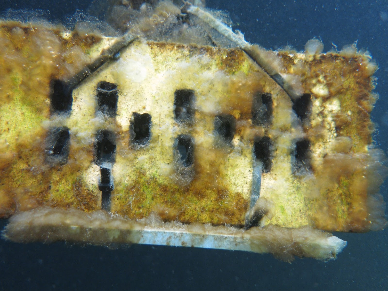 John, Robin, Marcel en ik staan klaar om het water in te gaan. Even vissen kijken en dan nog wat metingen doen. In het duikgebied is het zicht er nou niet beter op en onder het Paviljoen is het bar slecht. Ook op weg naar de diepte is het zweefvuil behoorlijk aanwezig. Na even zwemmen komen we dan op diepte aan. Mijn gerepareerde 7XRE lamp doet het gelukkig weer. Maand of wat geleden kwam ik erachter dat het binnenwerk echt volledig gecorrodeerd was. Ik had me er feitelijk al bij neergelegd dat ie niet meer te repareren was. Toch bleek een schoonmaakbeurt en een nieuw accupak wonderen te verrichten, dankzij Scuba Support.