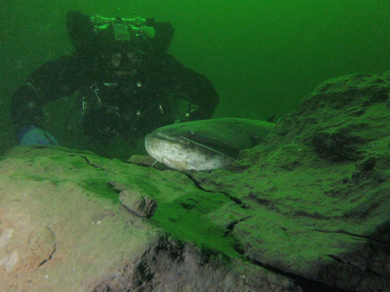 En oh wat een feest als je dan met die lichtbundel gewoon objecten die ver weg liggen gewoon kunt uitlichten. Robin en Marcel gaan naar rechts, maar John en ik gaan een iets andere kant op. Verdomd er ligt een meerval te rusten op een blok klei. Ik klap mijn diffusor voor mijn lamp. Eerst maak ik foto’s zonder flits en heel langzaam pak ik mijn lamp erbij. Gelukkig blijft ie mooi liggen en John ligt erachter. Dit is een perfect camera standpunt. Alle bewegingen doe ik extra langzaam om het niet te verstoren en het blijft ook mooi liggen. Dan komt Marcel aangezwommen en slaagt er ook in nog wat foto’s te maken.