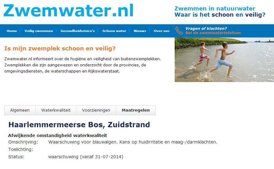 Op een bord bij de zwemwaterlocatie wordt uitgelegd waarom er een waarschuwing is gegeven. Jonge kinderen en ouderen, die het meest kwetsbaar zijn, kunnen beter een andere zwemplek kiezen.