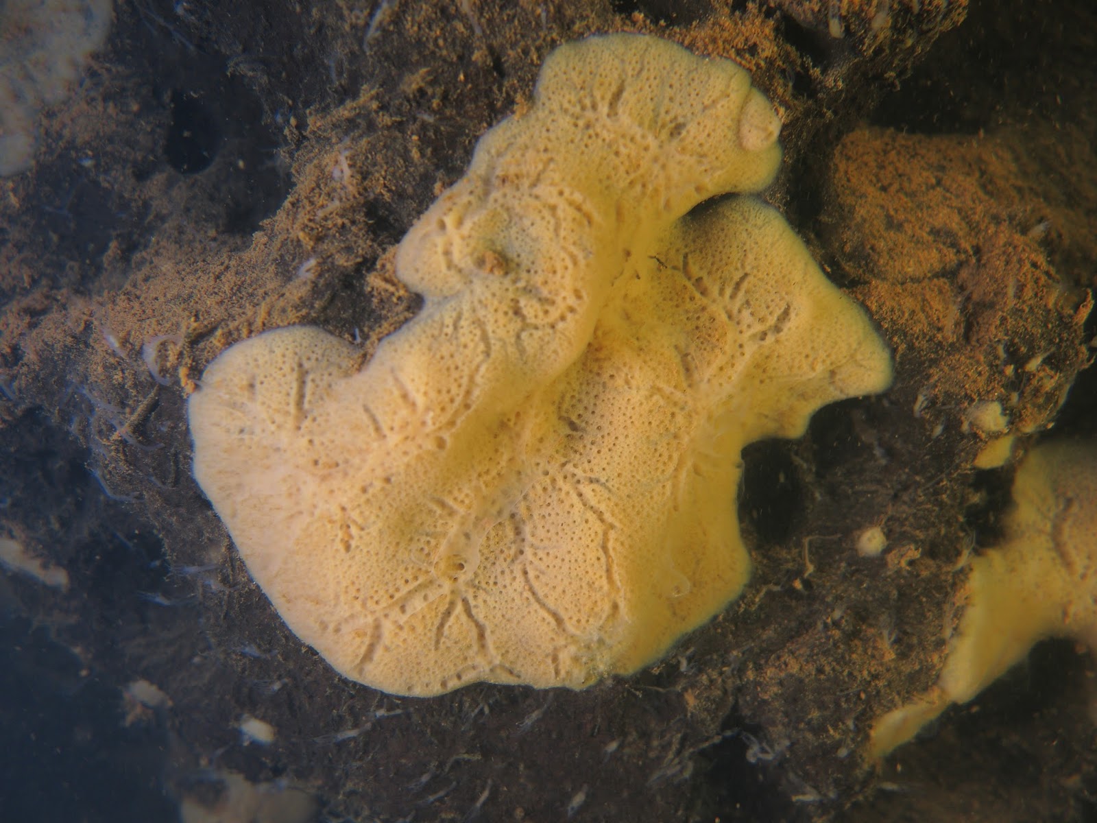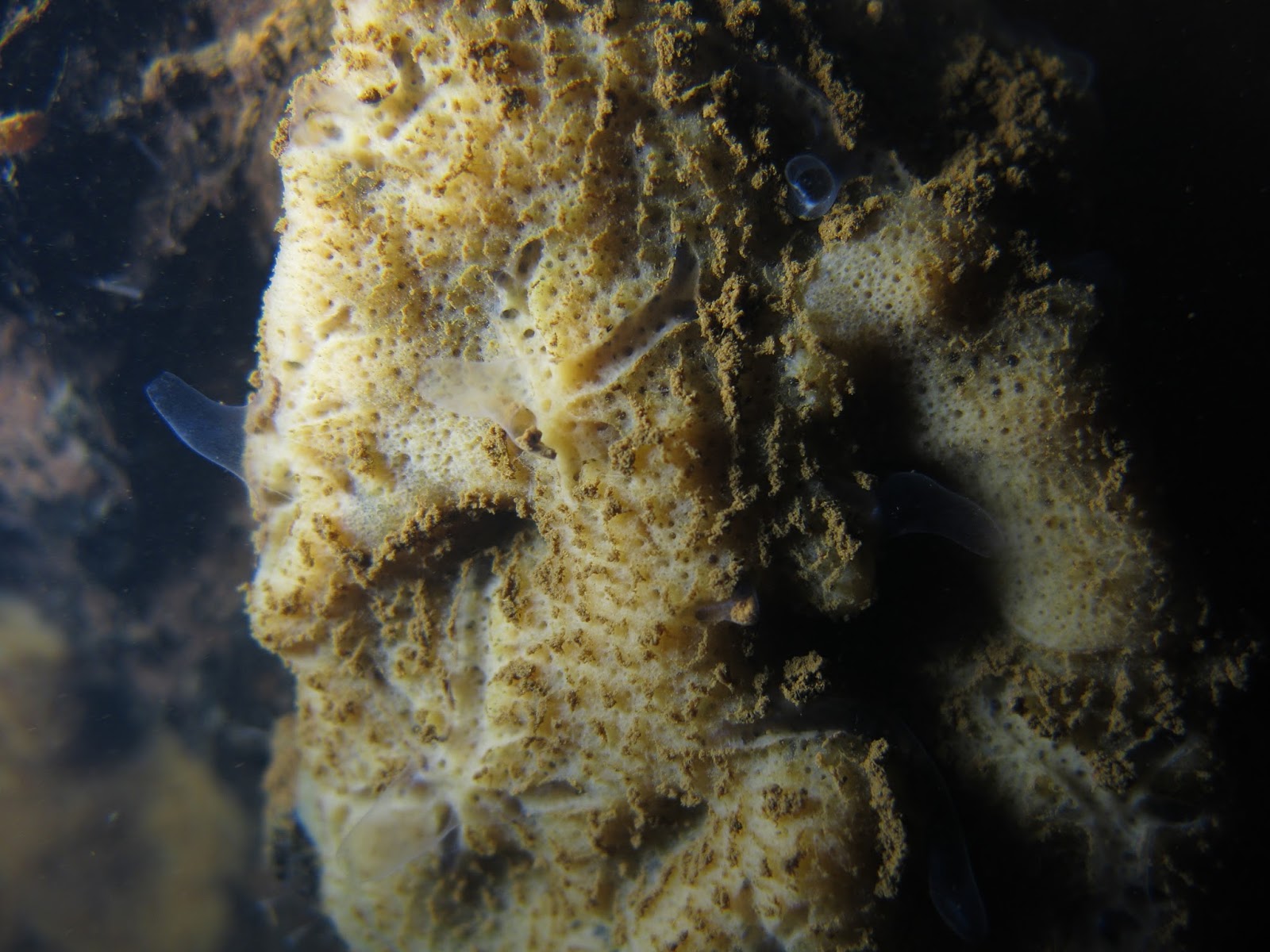 Dean en Ted gaan met Watze mee. Eenmaal onderwater is een goede gelijkenis te maken met de Zegerplas aangezien het ook een bruinrode kleur water is. Op 5 meter diepte komt het daglicht niet meer en lijkt het licht uit te gaan. We zwemmen langs de schuine bodem met hier en daar takken waar breekbare draden aan hangen. Op de bodem liggen gele wattige drab en laat ik die nou ook gezien hebben in de put van Ekeren bij Antwerpen. Het was iets met ijzer en fosfaatbinding meen ik. Het wemelt hier letterlijk van de zoetwatersponzen en de ene is nog mooier dan de ander. Ik wapper er eentje schoon en wacht tot het zweefvuil weg is. Het zijn toch wonderbaarlijk mooie exemplaren. Soms zijn de transparante uitstroombuizen goed te zien.