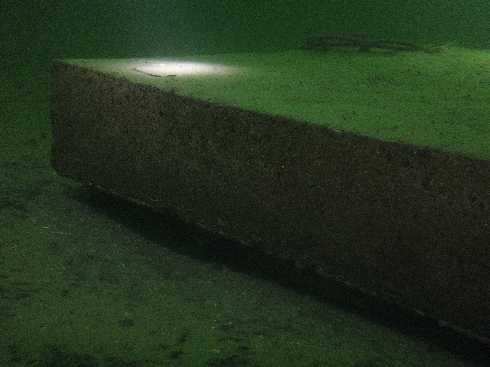 We komen een ankerlijn tegen en die beginnen we te volgen. De lijn ligt er los bij en er zit een aardige kluwe vislijn omheen. Die halen we zoveel mogelijk los. We komen uit bij het ponton en de slang is nog steeds goed opgebonden. We kijken even rond en als we pal noord zwemmen, zie ik een grote betonnen plaat liggen op de bodem op 16 meter.