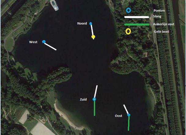 zoals het was. Onder de pontons hangen bruisplaten waaruit lucht wordt geblazen. Door deze bellenstroom wordt een watercirculatie op gang gebracht. Deze circulatie zorgt ervoor dat er geen spronglagen kunnen ontstaan en dat de aanwezige blauwalg bacterien veel minder uren zonlicht ontvangen. Er staan krachtige compressors aan de wal die de perslucht via een slangensysteem naar de pontons brengen. Die slangen zie je over de bodem lopen en de vele tie-raps zorgen dat de luchtslangen aan de kettingen blijven zitten. Blauwalg bacterien zijn kampioen in het opvangen van zonlicht en kunnen explosief groeien als de omstandigheden ideaal zijn. 2013 was het eerste proefjaar waarin de beluchting niet aangezet zou worden. Nu was het zo dat in 2013 een aantal weken lang een onderwater sneeuw was te zien en dat waren blauwalgen. Op een bepaald moment zakte dat weg naar de bodem.Er zijn in 2013 geen grenswaarden bereikt die de volksgezondheid in het gevaar bracht.