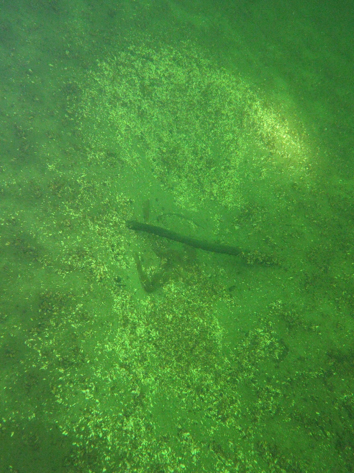 In de Zuidwest kom, zie ik meerdere boilies liggen op zo’n 5-6 meter diepte en uiteindelijk een leader met lood en een wit stuk aas. We laten deze netjes liggen zoals het hoort, alleen op de kant weten ze niet dat hier geen karper is te bekennen en die zijn niet bang van duikers. Het zijn net koeien.. ze schrikken heel snel, maar ze zijn oh zo nieuwsgierig.