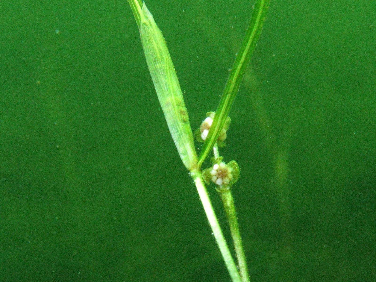 Zie ik het goed? Ja hoor het fonteinkruid staat onderwater in bloei! Twee piepkleine bloemetjes zijn het en dat op 2-3 meter diepte.