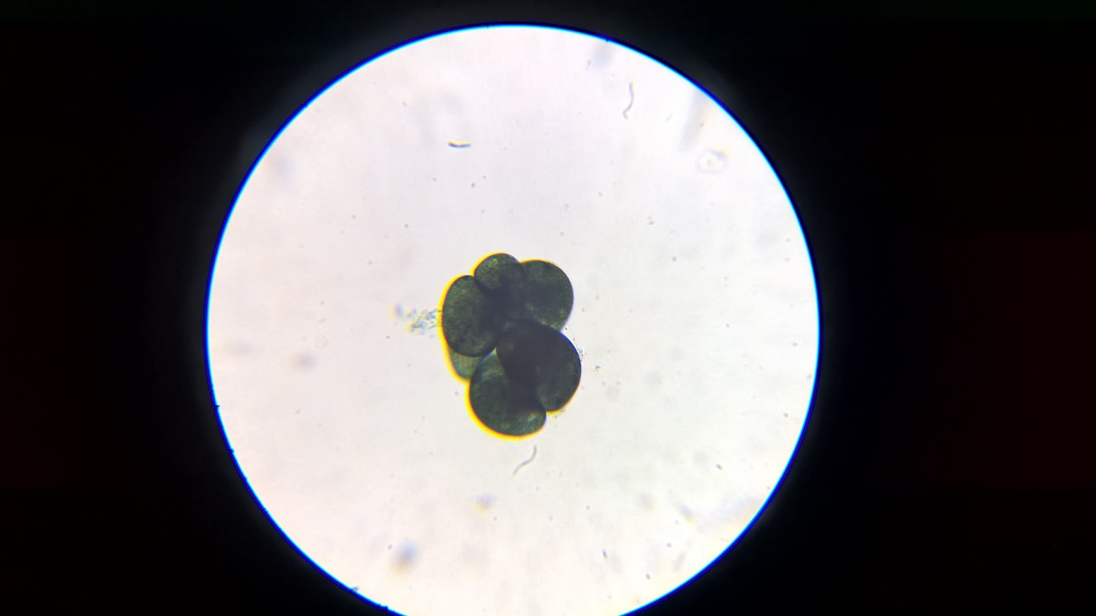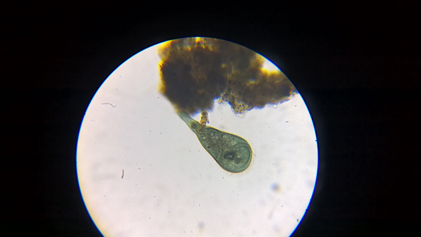 Het antwoord komt uiteindelijk wel als ik een dotje vuil opzuig en op het glaasje leg. Ik zie een blauwgroen balletje tot leven komen. Minuscule trilhaartjes bewegen en langzaam rekt het organisme zich uit. Het kan zich ook ontzettend snel voortbewegen.