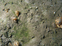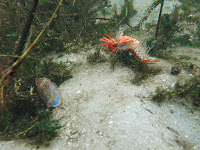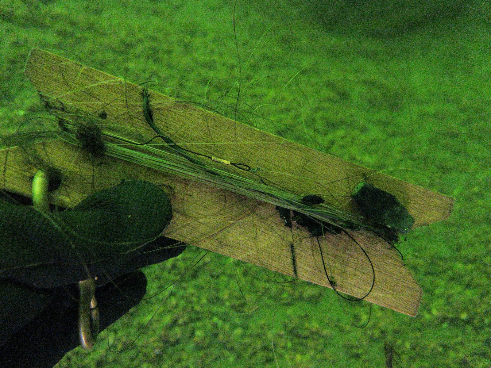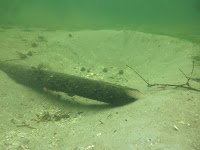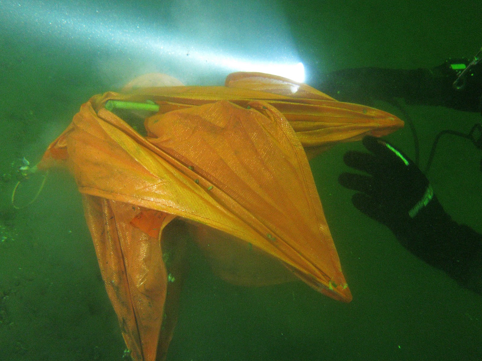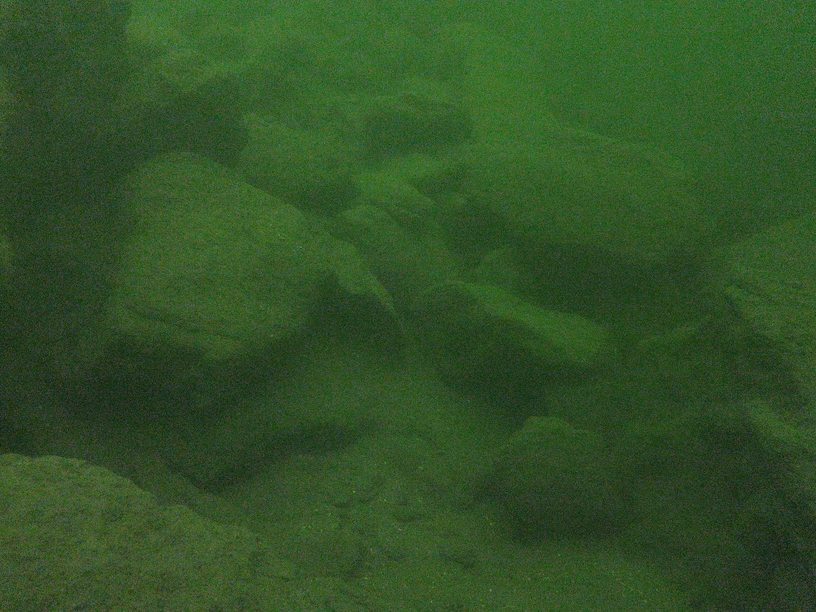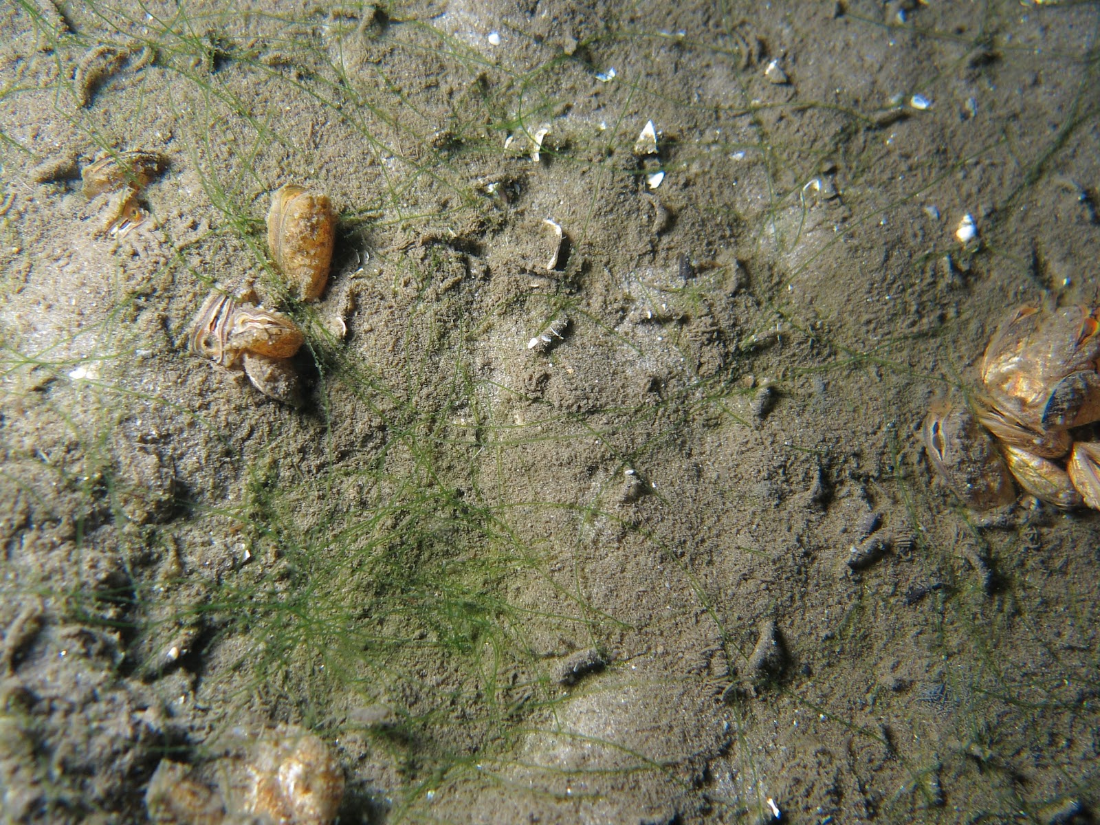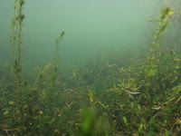 Af en toe komen we gigantische stofwolken tegen, die toch echt door vissen moeten zijn veroorzaakt. Tussen de 10 en 12 meter diepte vervolgen we onze weg naar ons doel. Het zicht is ontzettend goed. Op de bodem liggen fijne draadjes met algen, wat eruit ziet als groene filamenten. Het heeft wat weg van waternetje, maar ik had al geen ruimte meer in mijn zakken voor monsterpotjes, dus helaas moet ik dat een volgende keer eens bekijken.