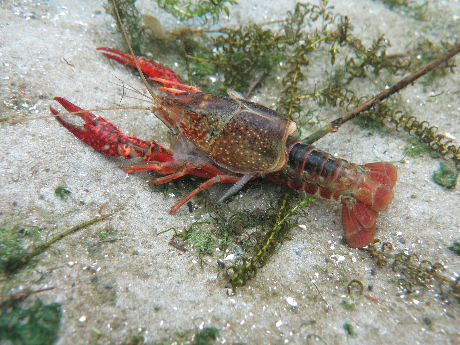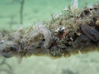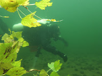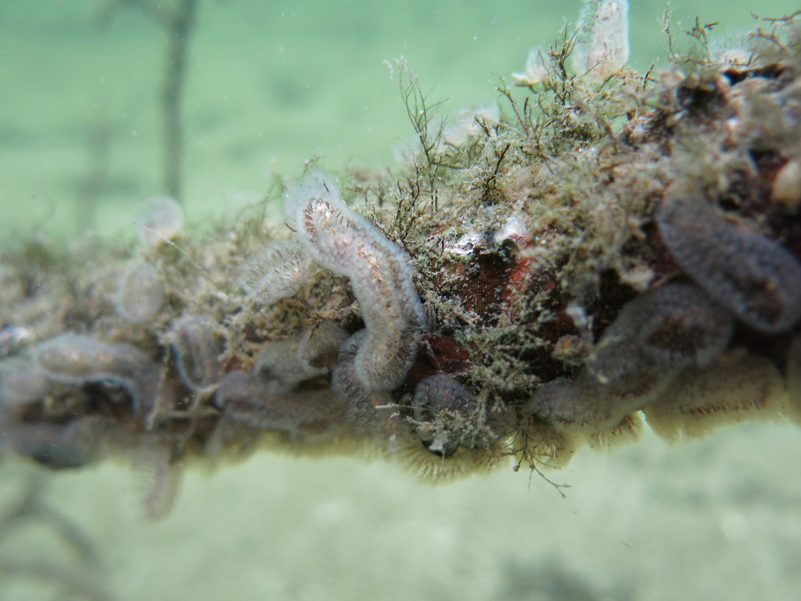 Fauna : Scholen jonge baars, 1 zwaar ademende paling. Enkele takken bedekt met mosdier kolonies.