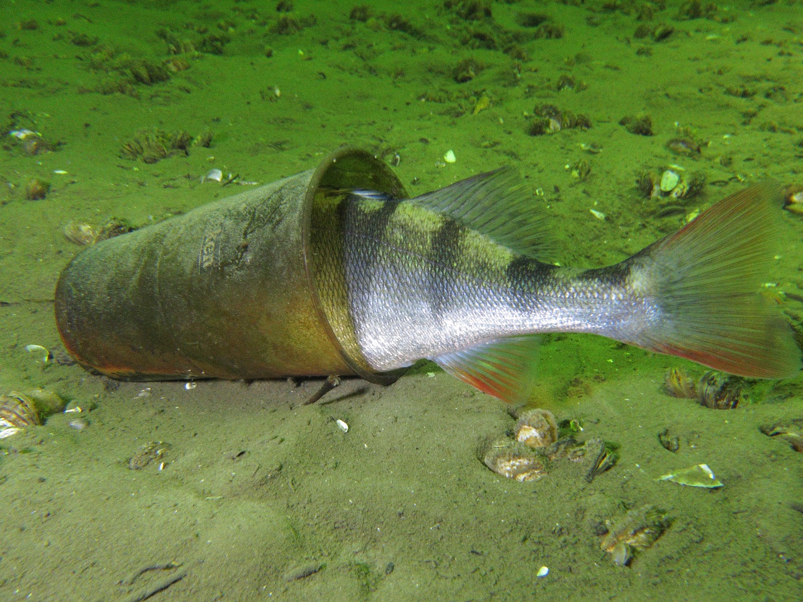 Bart seint naar ons om aan te geven dat ie wat gevonden heeft en het is een baars met de kop in een plastic beker. Zou ie nog leven?