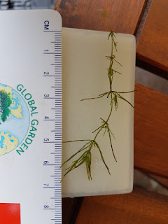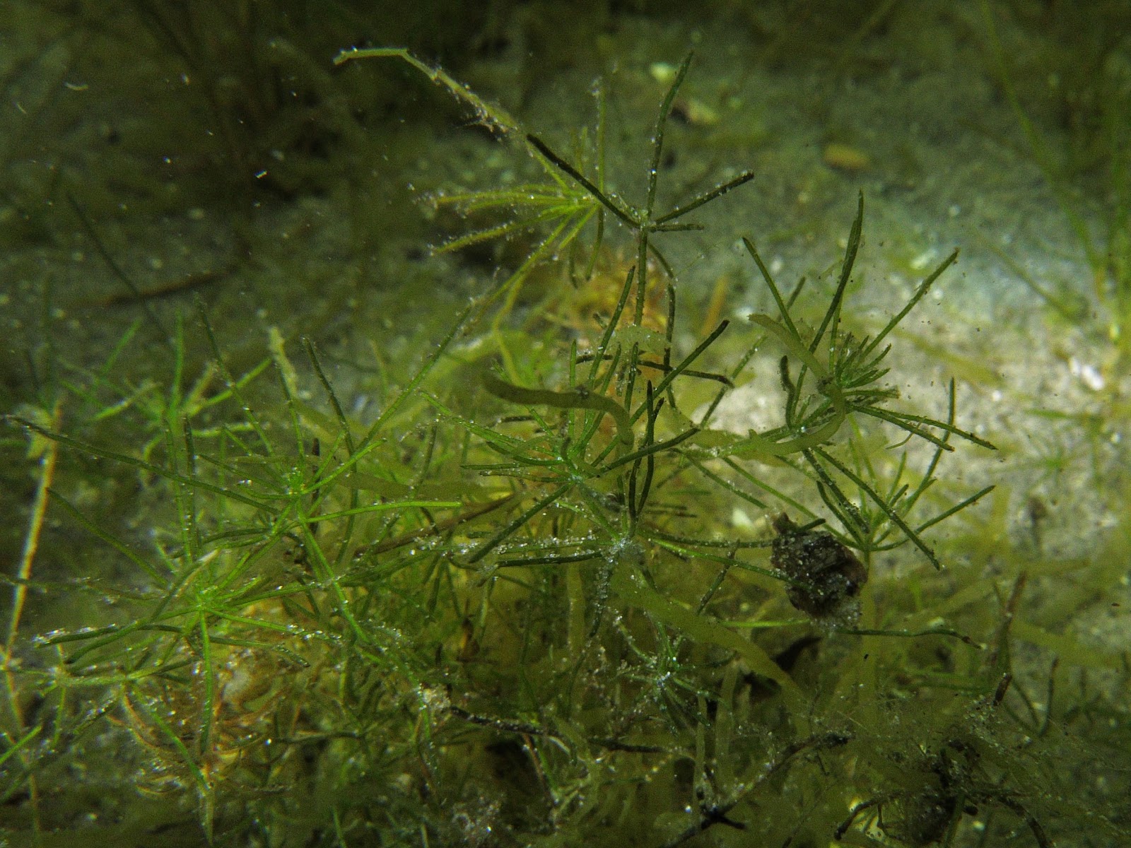Verderop concentreer ik mij op kranswieren en zo her en der vind ik een plantje, maar echte velden zijn er niet. De foto hieronder laat een kranswier zien.