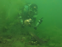 Dan komen we de westhoek die wat saai is en behoorlijk begroeit is met enorme algbedden. ook hier is het zicht soms bijzonder slecht om dan even later weer redelijk op te klaren. Tussen de algen liggen hier en daar palingen, waarvan de meeste al wegzwemmen voordat we bij ze kunnen komen, maar eentje blijft er liggen. Jorn veegt voorzichtig wat dotten algen weg, zodat ie een filmpje kan maken.