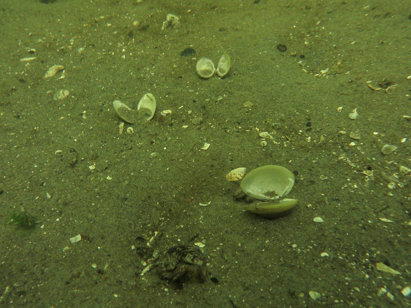 De purperbacteriën die wij op 4 september zagen zijn weg. Sommige mosselen zijn overdekt met sediment, terwijl andere net aan wel bloot liggen.