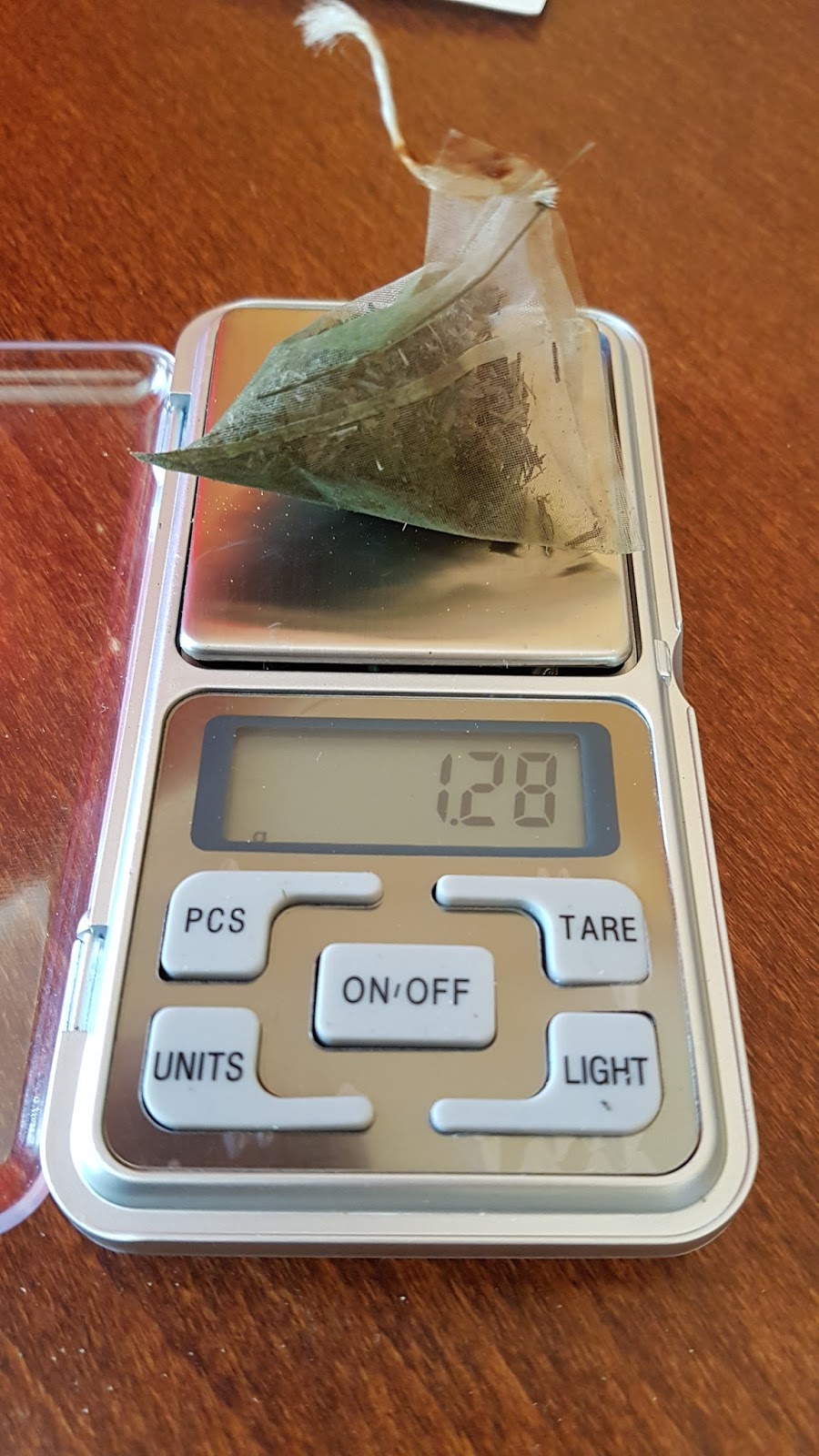 Met een weegschaal die tiende grammen aankan, meten we het gewicht van een zakje rooibos en groene thee vóórdat ze het water in gaan en na 90 dagen doen we dat weer.