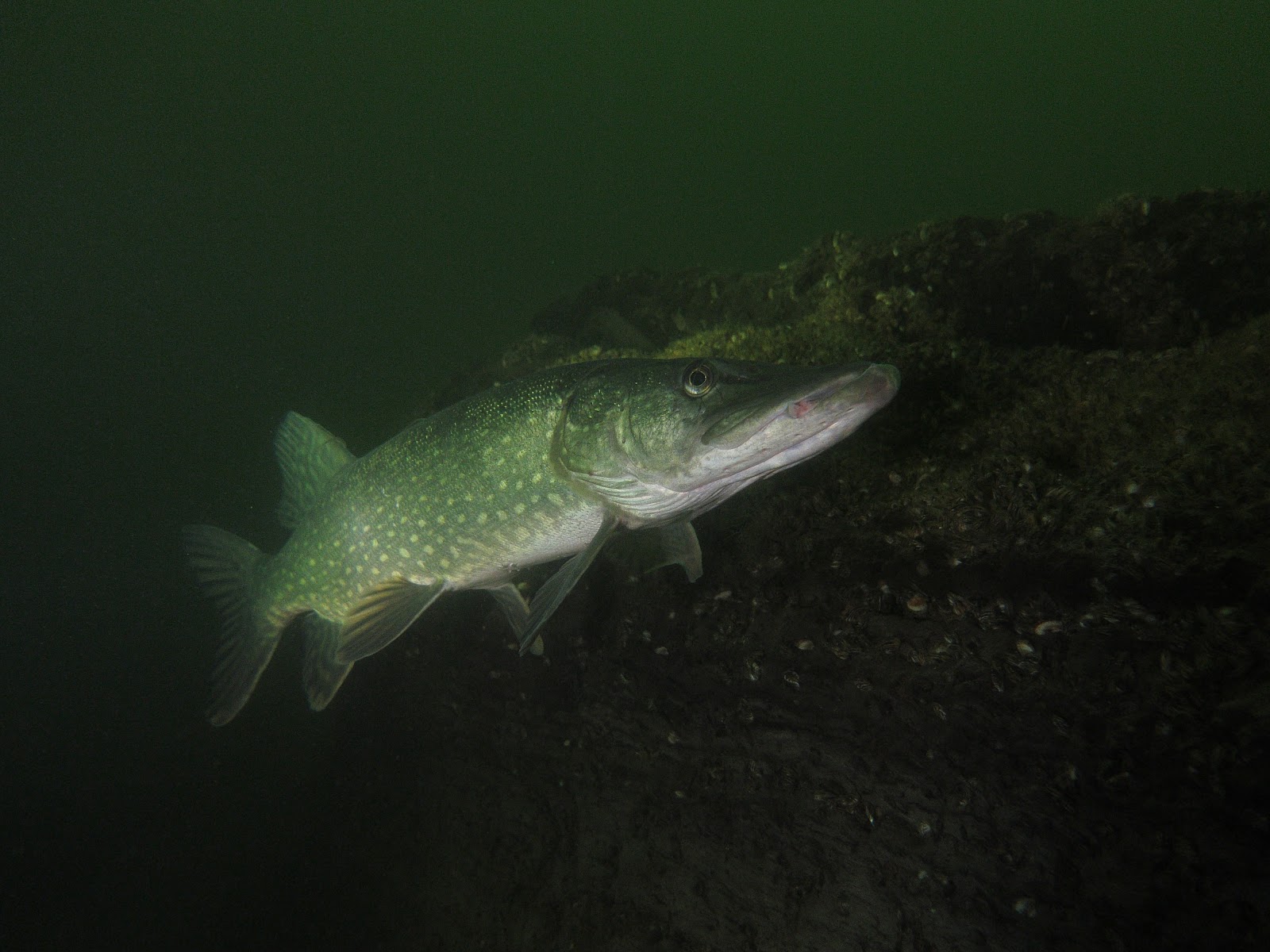 Niet veel verder komen we een prachtige snoek tegen, maar het heeft wel een beschadiging net achter de kop en ook de bek is aan de rechterzijde beschadigd. Er zitten twee striemen op het rechter oog. Die kon wel eens ergens vast in hebben gezeten.