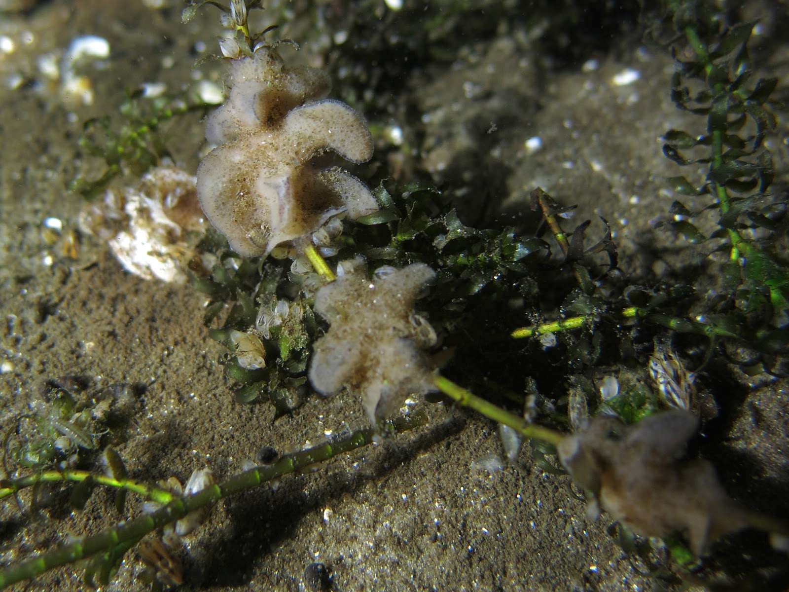 Het waterpest huist nog meer aanwas in de vorm van jonge sponzen. Deze zaten op een diepte van circa 5 meter Het is goed om dit te zien.