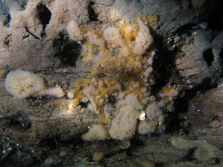 Soms lijken sponzen weg te smelten, wanneer de gaten er in vallen zoals de linker foto laat zien. Net boven die diepte was de temperatuur 18,5 Celsius terwijl de spons net onder de spronglaag zat in 12 Celsius.