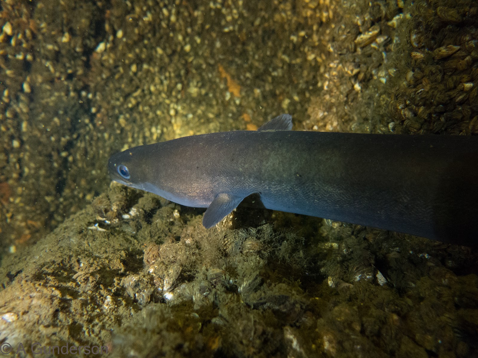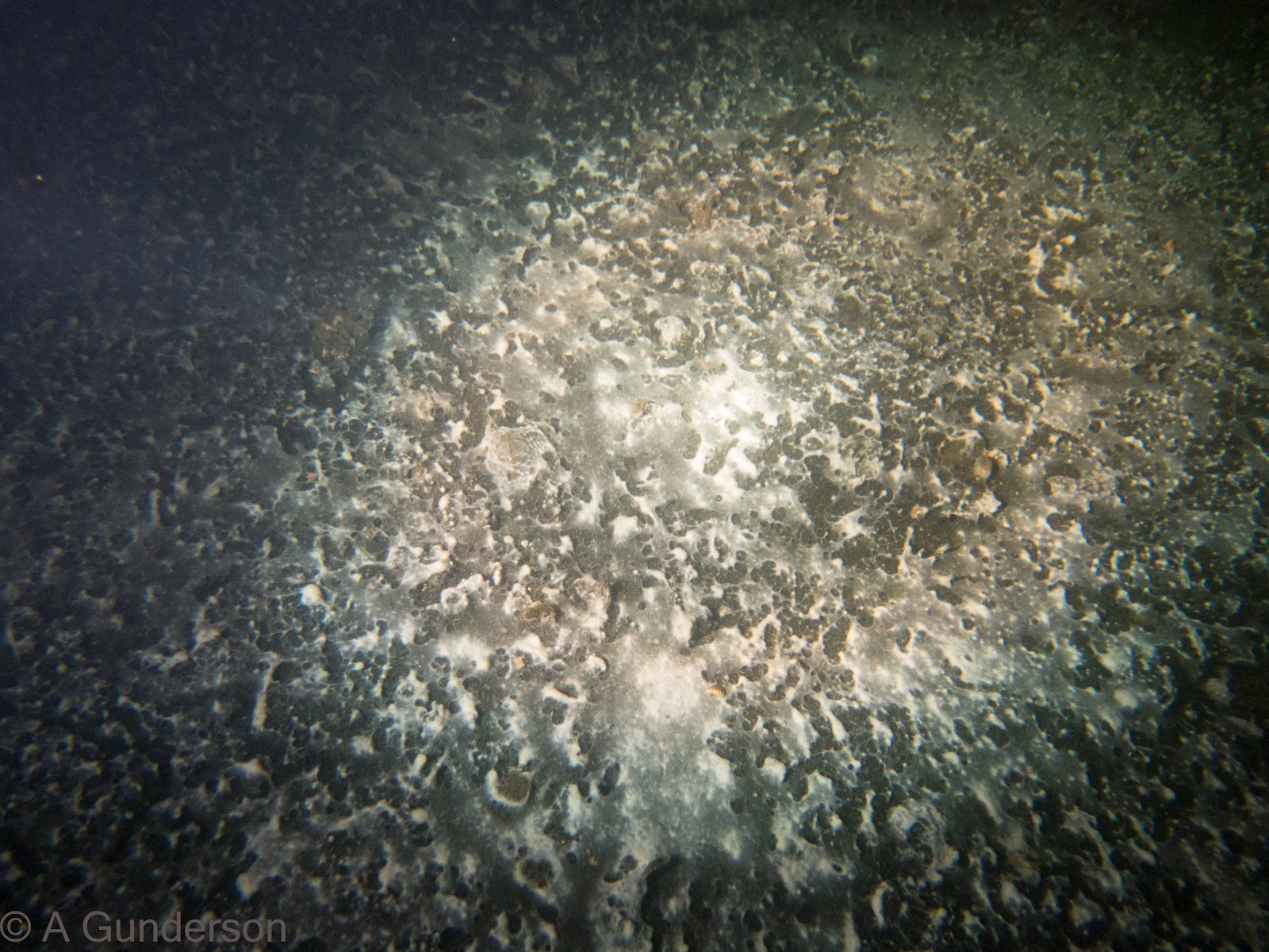 Naarmate we verder naar het zuiden wegzwemmen wordt het zicht ook minder en verstrooit het lamplicht. Het water is wat bruinig en op de bodem zie ik kokertjes omhoog steken.