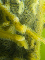 De onderstaande foto is, tja een sponsje.. leuk hoor, maar als je wat gedetaileerder kijkt (klik maar op de foto), dan zie je ineens linksonder van de spons wat wattige aangroei. Dat zijn de mini tentakeltjes van een Plumatella soort ofwel een mosdiertje. Die komen ook in verschillende uitvoeringen, waarvan men de meest bekende de wormachtige Cristatella versie is (Zie foto eronder van 2013.)