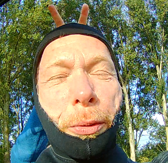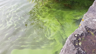 Letterlijk wel te verstaan, want op het water ligt een laag blauwalg, waarbij je gaat denken of het wel verstandig is en of wij er als een groene Hulk uit het water willen stappen.