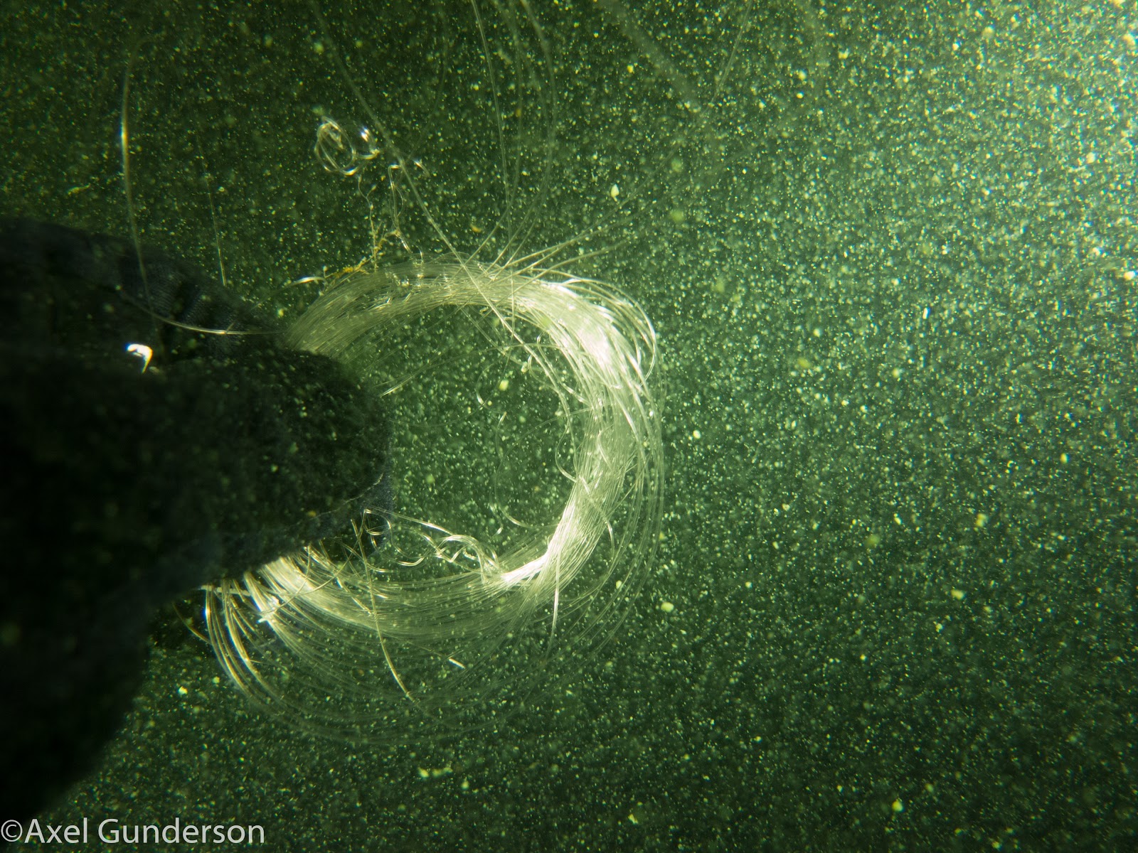 Ja hoor, het zal weer eens niet. Ik zie niet veel, maar wel net dat ene glinsteringetje in mijn ooghoek. Visdraad. Ik twijfel of het een live draad is, maar na een paar lichte rukjes gebeurt er niks. Eens even kijken wat daar aan vast zit. Er is iemand geweest die zijn/haar geluk wil beproeven bij het Paviljoen en vissen zijn echt niet gek. Die rijgen gerust een achtknoop tussen de palen door. Walther en Bart schijnen mij bij terwijl ik de handel oprol.