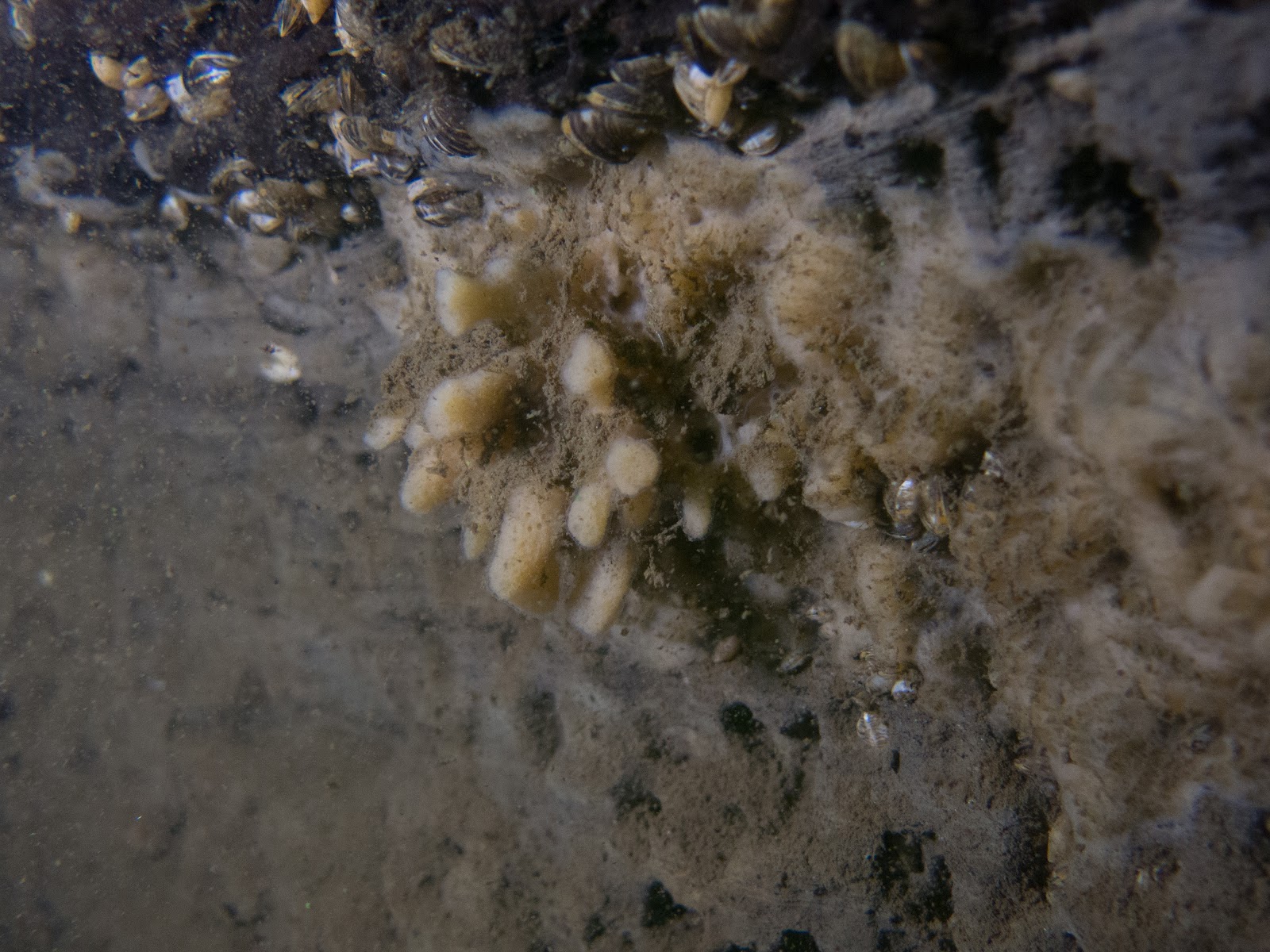 Dan buigen we af naar een dieper gedeelte en zet met de grote camera nog een zoetwaterspons op de foto.