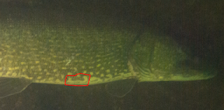 Later blijkt, dat Jorn deze zelfde snoek ook op de foto heeft gezet met een regenboog projectie erop. Ook Peter Boots heeft deze dame erop staan, echter had ze deze zomer toen nog schade aan haar rechter kieuwdeksel, waarbij er een stuk kieuw uit leek te hangen en dat is nu hersteld.