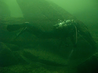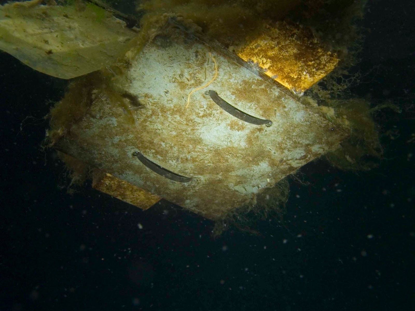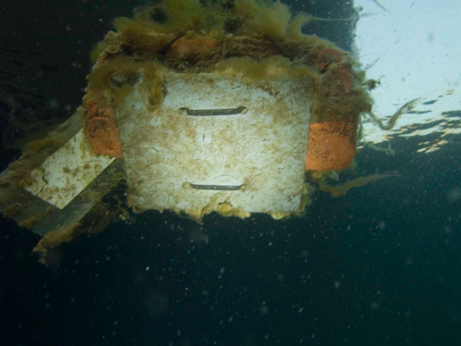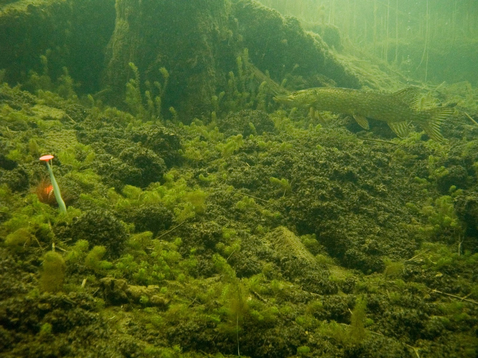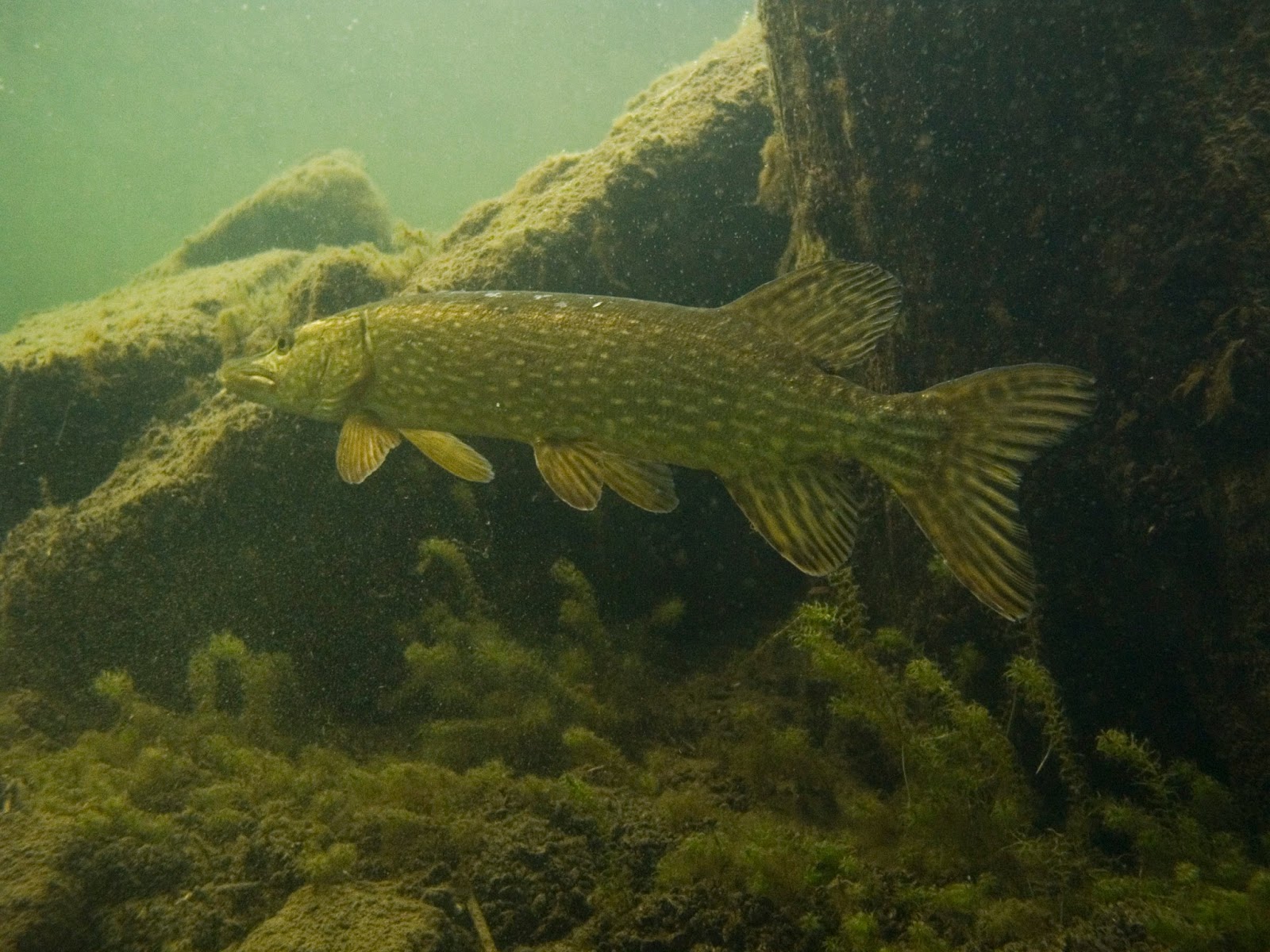 Robin ziet al snel een snoek bij een kleiblok en deze lag erg verdekt opgesteld. Op het rad hangen nog steeds geen baars eieren, maar deze zijn nu ondieper afgezet buiten het duikgebied. In het voorgaande jaar waren deze dieper te vinden toen het daar ook warmer was door het mengen van de pompen. De ene na de andere paling schiet weg, want ze zijn erg schuw. Zo langs de 7 meter lijn komen we nog een snoekbaars tegen en ik zie ook een bootsman-achtige larf in het water met zijn armpjes roeien. Af en toe een wolkje jonge aasgarnalen. Als we bij de steiger aankomen zie ik meerdere verloren kunstaas op de bodem liggen en bij 1 ligt een prachtige snoek.