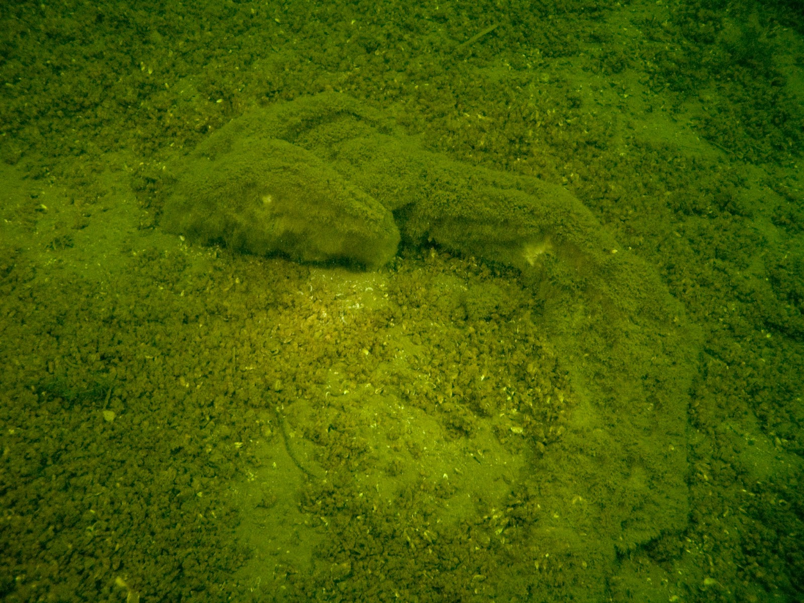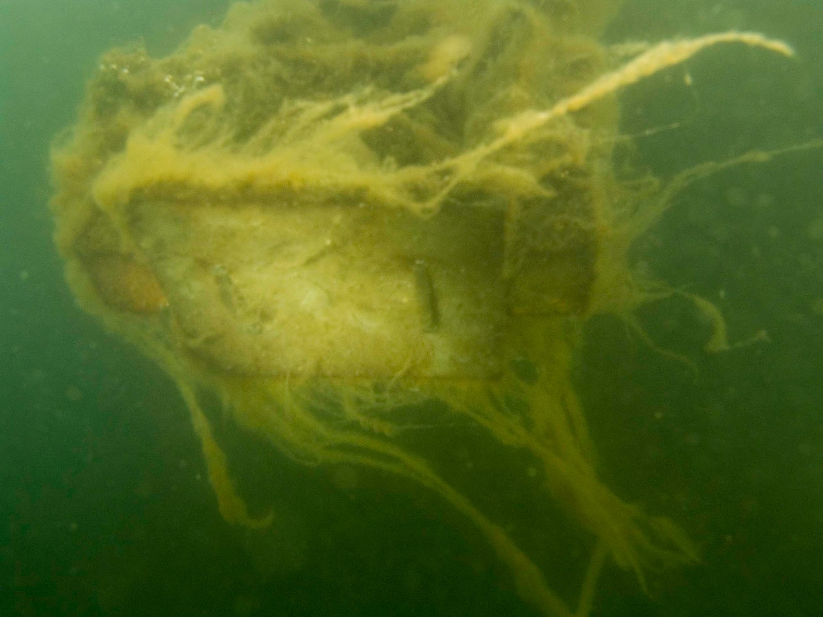 Het doel van vandaag was om als eerste een foto van het dekzeil te maken. Het zicht was echter bij het instappunt zo belabberd, dat we elkaar eigenlijk al snel kwijt raakte. Het dekzeil ligt op 5 meter diepte echter is het in zulk zicht een zoektocht… ook naar je team genoot in dit geval. Joris zwom naast mij en Mark was weg. Even naar boven en we hadden hem weer gevonden.