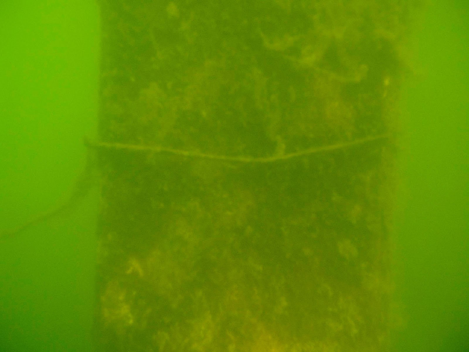 Dus toen maar besloten onder de thermocline te gaan en dan naar het Paviljoen te zwemmen. Het zicht onder de thermocline hebben we niet gemeten, maar het is zeker 10 meter. Boven je hangt het mooie gelaagde dak van de mist op ca 8 meter diepte. Het is jammer dat het op een foto niet zo mooi uitkomt als dat je het in het echt ziet. Bij de paal aangekomen maken we een opstijging naar 6 meter. Zo zie je elkaar en zo zie je alleen nog het gedempte licht van de lampen. Een zichtmeting is met zulk zicht wel lekker snel klaar. Joris helpt mij met het ophangen van de zichtmeters en Mark houdt alles in de gaten. Ik meet 2,10 meter minus een correctie van 20 cm is 1,90 meter. Als ik het meetlint strak trek zie ik ineens weer contrast in de Duthi en Secchi en als ik het los laat verdwijnt het contrast. Als het zicht zo slecht is, zit dus de nauwkeurigheid in enkele centimeters, maar dat is niet relevant. Een foto maken van de paal is bijna geen doen, omdat mijn camera niet goed kan scherp stellen. Op 3 meter diepte wordt het licht meer verstrooid. We maken de volgende foto. Even een controle doen bij de SETL platen.
