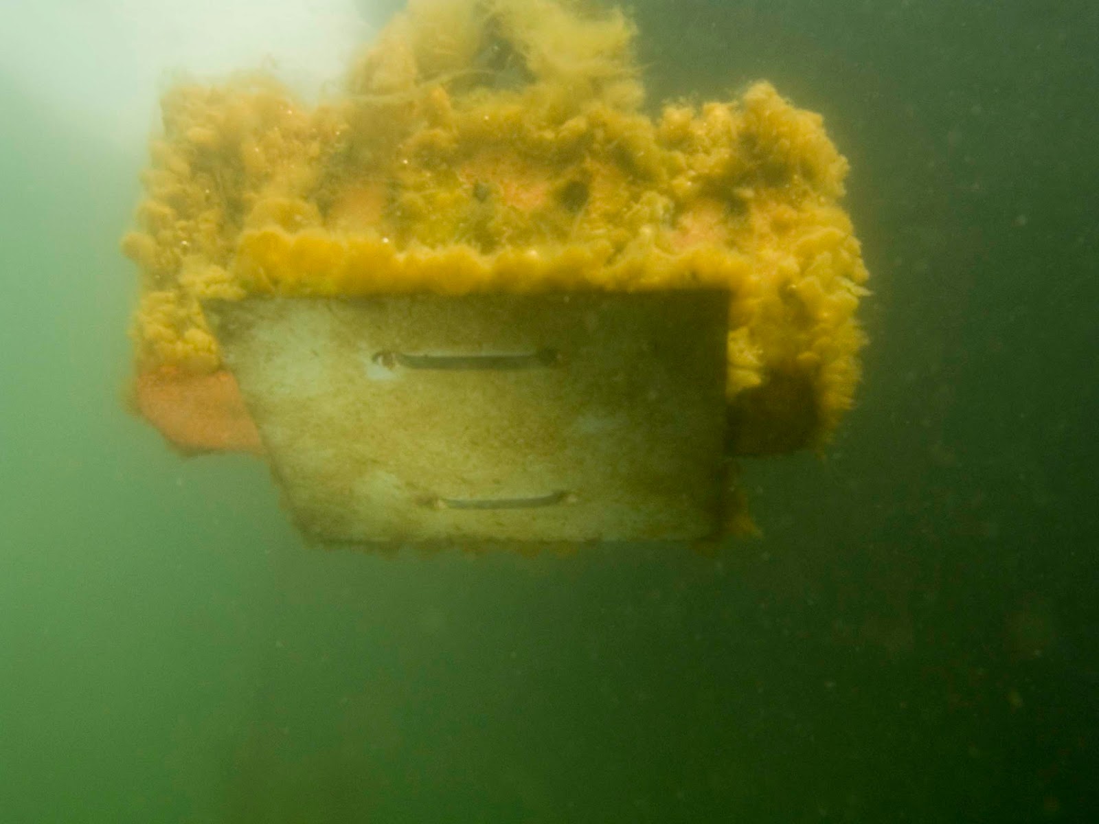 Het wordt tijd om weer af te zakken. De grens tussen troebel en helder ligt bij de paal op 8 meter diepte en de overgang is scherper dan vorige week. We zwemmen even richting het zuiden en buigen al snel af naar het zuidwesten. Langs de ankerlijn van het zuidwest ponton die wij kruisen ligt een spoor stof. We kruipen iets de thermocline in. Je voelt nu echt goed het verschil tussen onder en boven de thermocline. Op 8 meter gaan we terug richting het Paviljoen. Aan de zuidkant van het Paviljoen ligt een grote verschimmelde dode vis wat lijkt op een snoek. De dode kabeljauwen aan de andere kant liggen er ook verschimmeld bij. Als we door de thermocline opstijgen de mist in, wordt het beduidend warmer. Veel duikers gaan het water in als wij er uit gaan. Zie alle foto’s van deze duik.