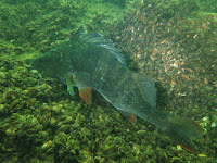 Na 40 minuten draaien we om. In de ondieptes tussen de waterplanten zit veel vis, waaronder een prachtig getekende snoek.